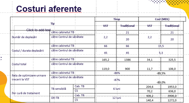 Timpul și banii par să fie cele mai prețioase economii pentru pacienții cu TB, care zilnic trebuie să ia preparate medicamentoase. Altă dată, arată datele studiului, persoanele care primeau tratamentul DOT la cabinetul TB al secției consultative din raion alocau, în medie 66 minute pe zi, iar cei care mergeau la Centrul de Sănătate din sat, tot pentru tratament, 45 minute pe zi. Acum, pacienților incluși în tratamentul video observat le ia doar două minute pe zi ca să-și administreze tratamentul.