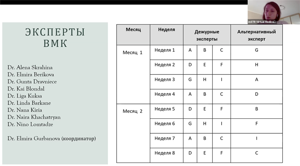 The Virtual Medical Council consists of 10 clinical experts, including the VMC Coordinator Dr. Elmira Gurbanova, who is responsible for shaping a consolidated collegial response in the country on behalf of the entire medical council. In her presentation at the online meeting, Dr. Gurbanova emphasized that the consultations and recommendations of the VMC experts will cover the following issues: