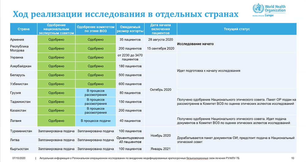 The VMC began its works in September in parallel with the onset of the treatment for the first patients under the regional operational study on the introduction of modified short-term, completely non-injection MDR/RR-TB treatment regimens (as part of the European TB Research Initiative).