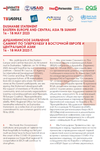Участники Саммита по ТБ в Восточной Европе и Центральной Азии (ВЕЦА) собрались в Душанбе (Таджикистан) 16 - 18 мая 2023 г. при содействии со-организаторов мероприятия – Глобального кокуса по ТБ, Агентства США по международному развитию (USAID), Центра PAS и Партнерства “Остановить ТБ”, а также представители организаций, участвующих в борьбе против ТБ в регионе ВЕЦА, разделяя взгляды участников Саммита подписали данное заявление , разработанное при поддержке членов сообщества, затронутого ТБ, и организаций гражданского общества при лидерстве организационных и партнеров TBpeople, Европейской коалиции по борьбе с ТБ, TBpeopleUkraine, Молдавской Национальной Ассоциации ТБ Пациентов «SMIT», именуемое в дальнейшем «Душанбинское заявление», как отражение приверженности к общей цели – ликвидации ТБ до 2030 года.